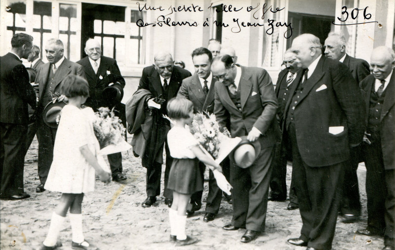 Une petite fille offrant un bouquet de fleurs à Monsieur Jean Zay, Ministre de l'Éducation nationale et conseiller général du Loiret, à l'occasion de l'inauguration de la colonie des oeuvres universitaires du Loiret aux Sables-d'Olonne, le 16 juillet 1939. Phot. Arnault-Astra, n°306.