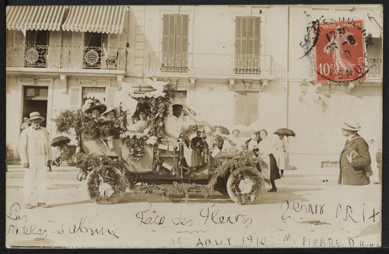 Carte postale sépia d'une voiture décorée de fleurs ayant remporté le 2ème prix à l'occasion de la fête des Fleurs de 1910.