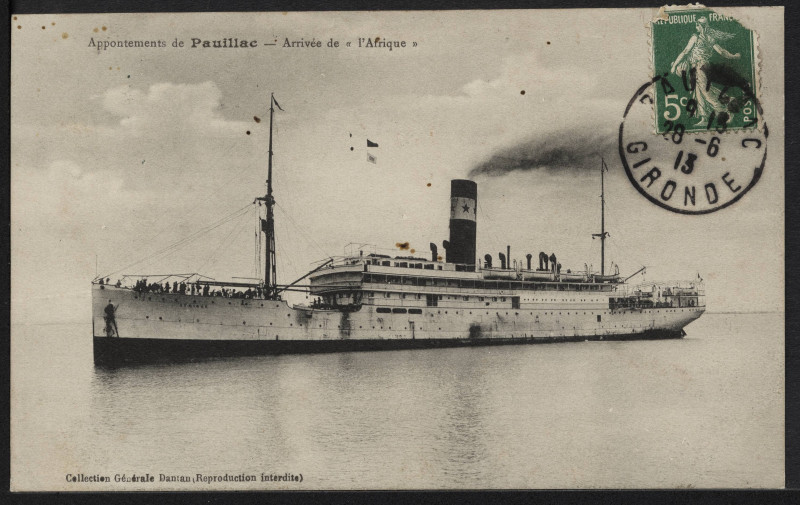 Carte postale du Paquebot Afrique à son arrivée à Pauillac (Gironde), circa 1913, AMLS, fonds Léo Leboucher, 44 Fi 14