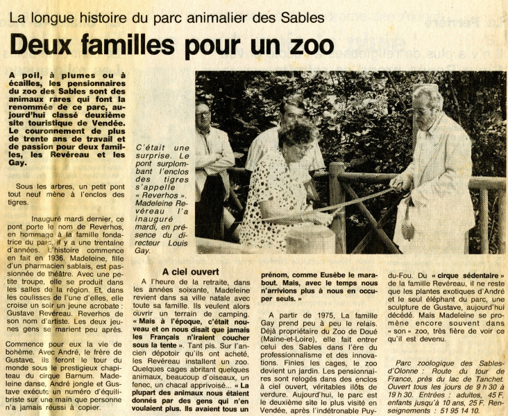 En 1975, Madeleine Reverho cède l'exploitation du zoo à Louis Gay, propriétaire du parc zoologique « Les Minières » à Doué la Fontaine. Le « parc zoologique des Sables-d'Olonne » ouvre ses portes le 15 mars suivant et sa régularisation administrative intervient en 1980. Depuis, le zoo ne va alors cesser de s'étendre pour atteindre aujourd'hui près de 3 ha. La nouvelle extension du zoo comprenant l'aménagement de « l'île aux singes » est ainsi inaugurée en juillet 1986. Chaque année apporte également son lot de grands bonheurs :