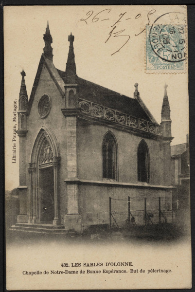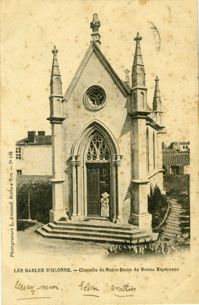 "Pendant le choléra [de 1849], qui désolait la ville, l'abbé Michaud, curé des Sables, organisa une procession pour implorer le secours de Notre-Dame de Bonne-Espérance. L'épidémie cessa aussitôt. On construisit alors la chapelle de Notre-Dame de-Bonne-Espérance qui renferme la statue miraculeuse" (journal La Plage, n°12 du 9 septembre 1923).